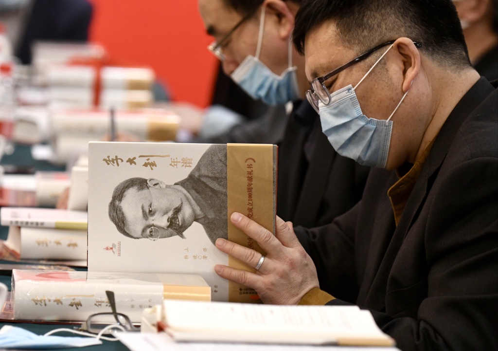 3月31日,《李大钊年谱》新书发布会在北京大学举行,与会人员认真阅读新书。和冠欣 摄